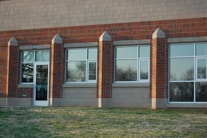 Southeast view of new cafeteria and insulated curtain wall system before landscaping