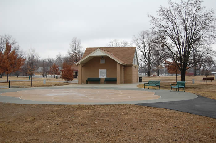 Existing 8 year old restroom building shown with new control room inside addition, behind 2 benches, under a new covered patio.